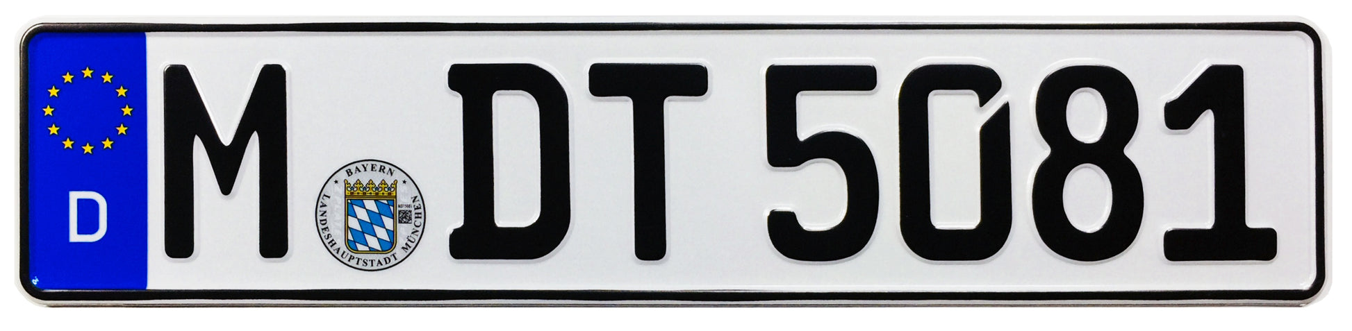 We manufacture 2 plates with each number configuration, one front plate and one rear plate. Thus, each front or rear German license plate will have a unique number. The City code (M) and letters will be the same as pictured; only the last number digits will be different. This ensures no duplicates are issued. The back of the license plate has a Z Plates Certificate of Authenticity registration seal with a unique number.